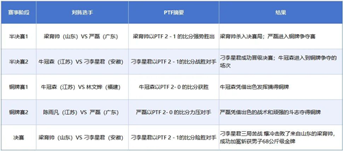 在决赛中,面对实力强劲的对手,刁李星君丝毫没有畏惧,依然保持平常心态。他巧妙地运用战术,不断寻找对手的破绽,抓住时机果断出击,最终以2比1击败山东名将、巴黎奥运会季军梁育帅。