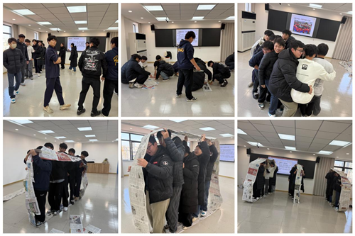 活动伊始,“桃花朵朵开”破冰游戏迅速拉近了同学们的距离,现场气氛轻松活跃。随后进行的核心环节“车轮滚滚”考验了各小组的协作能力与策略执行——同学们利用报纸和胶带制作“风火轮”,齐心协力完成10米竞速挑战。在分享环节中,大家畅谈合作中的感悟与收获,进一步加深了彼此的理解与信任。紧接着的“万里长城永不倒”活动,则以身体互动强化了团队支持与默契。