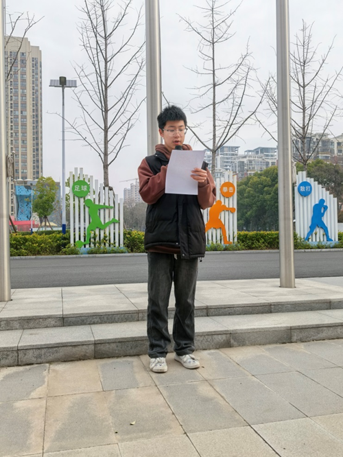 升旗仪式结束后,九(3)班学生周宏宇以“学雷锋,做时代好少年”为主题进行国旗下演讲。他号召同学们以雷锋为榜样, 从身边小事做起,将助人为乐、勤俭节约、爱岗敬业的精神融入日常学习与训练中,用实际行动践行新时代青少年的责任与担当。真挚的演讲赢得了全场师生的热烈掌声。